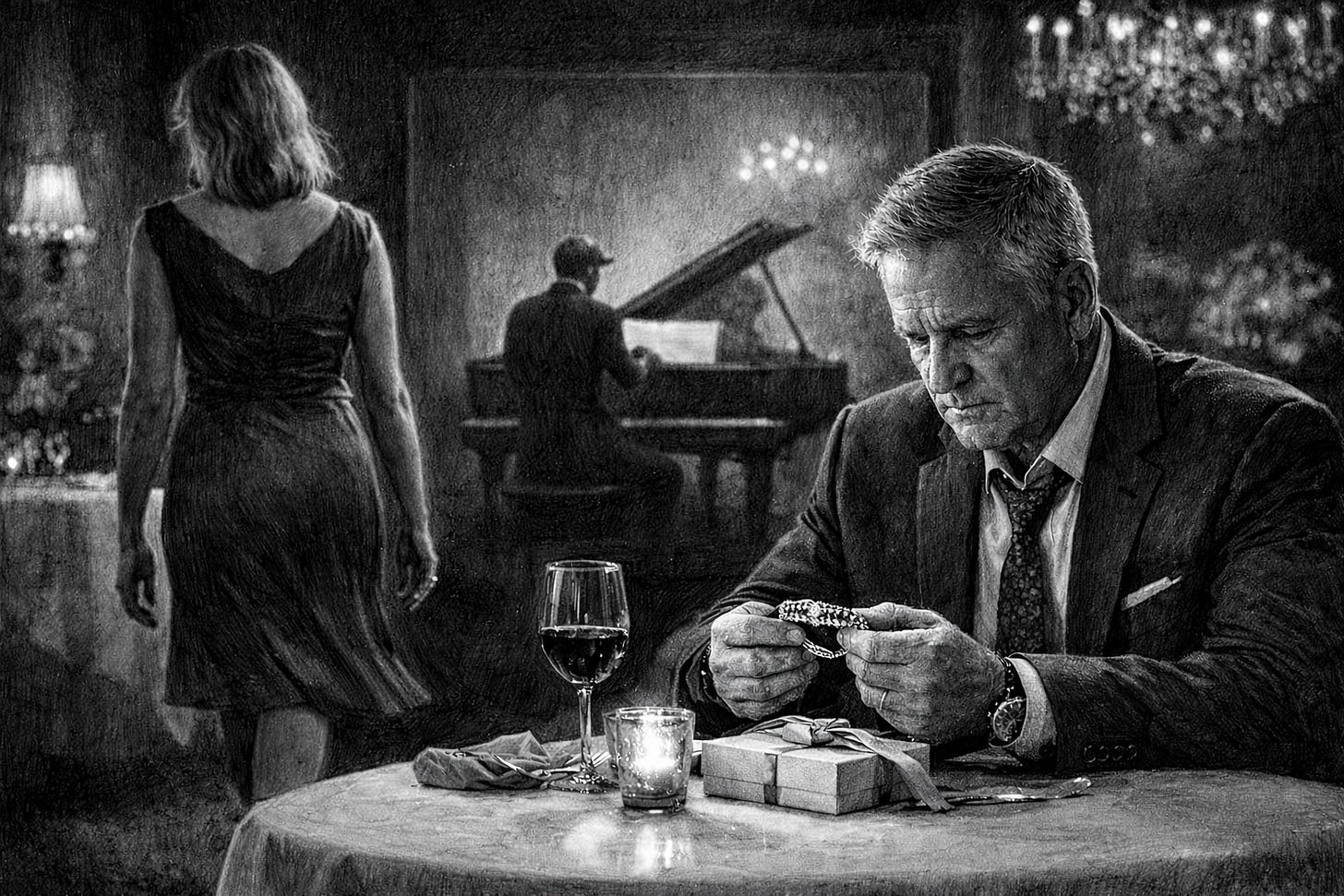 Behind her, through glass and candlelight and emerald glow, a man sat alone at a table in the back corner of Angelo’s, staring at a bracelet that cost a fortune, waiting for some kind of feeling to arrive.